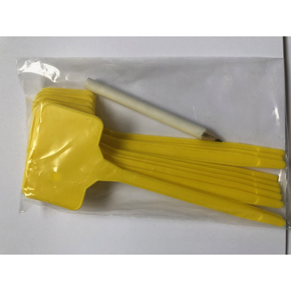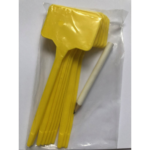 Lot de 10 étiquettes en T de couleur jaune. Elles sont en plastique rigide, plus résistantes que les étiquettes souples. Elles peuvent être utilisées plusieurs années. Un crayon de bois est inclus et offert avec les 10 étiquettes pour noter tout ce dont vous avez besoin. Ces étiquettes à planter sont souvent utilisées lors de la réalisation de semis pour noter la date, le nom de la variété, la semaine de semis ... Idéales pour identifier vos plantations!