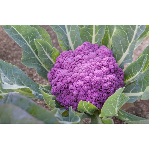Le chou-fleur violet de Sicile se distingue par ses grandes têtes aux teintes violettes intenses. Cette couleur unique est due à la présence d'anthocyanes, les mêmes antioxydants que l'on trouve dans les baies. Les feuilles entourant la tête sont d'un vert riche et robuste. Les plantes peuvent atteindre une hauteur et une largeur substantielles, nécessitant un espace adéquat pour se développer pleinement. Le chou fleur à une taille de 10-15 cm à maturité. Il peut atteindre 1 à 1,5kg. Cette variété à la couleur particulière est une variété tardive qui a besoin d'un fort besoin en eau pour répondre au besoin et à la croissance de cette plante.