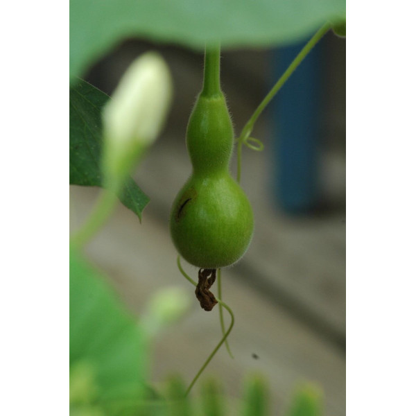 La Calebasse ou Gourde Pèlerine est une plante grimpante largement cultivée pour ses fruits uniques en forme de bouteille, utilisés traditionnellement comme récipients, instruments de musique ou objets décoratifs. Ses grandes fleurs blanches sont également un bel atout décoratif pour les treillages et pergolas.