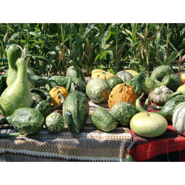 La Calebasse Dinosaur, également connue sous le nom de Gourde Bouteille, est une variété de cucurbitacée qui produit des fruits longs et allongés ressemblant à des bouteilles ou des dinosaures, d'où son nom.