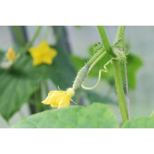 Croissance et feuillage : Les plants de cornichon Hokus ont un feuillage vert dense. Les fleurs sont de couleur jaune pâle, typique de la famille des cucurbitacées.