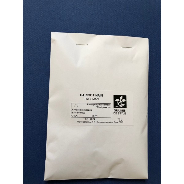 Le haricot nain à filet talisman est une variété de haricot à filet de couleur verte. Cette variété de graines de haricots nains à filets produit des très fines gousses vertes, sans fil d’une longueur variant de 15 à 20 cm. Il est résistant et très productif : c’est un classique dans les jardins. Il peut se consommer en filet extra fin mais aussi en mangetout. Le semis s’étale d’avril à août pour une récolte de juillet à septembre/octobre. Pour se développer dans de bonnes conditions, il faudra le placer dans un endroit ensoleillé avec un sol de préférence riche, léger et bien drainé. La densité de plantation est 6 cm entre chaque plant et 40 cm entre les rangs avec une hauteur de 45 cm.