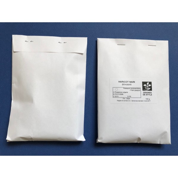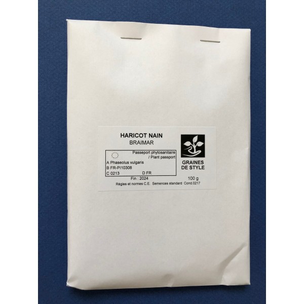 Le haricot nain mangetout Braimar est une variété hâtive de haricot mangetout et très productive. Elle produit de belles gousses rondes et longues d’environ 18 cm, renfermant à l’intérieur des grains couleur noisette. Cette variété de graines de haricots nains mangetout a la particularité de produire ses gousses au-dessus de la végétation. C’est assez pratique lors de la récolte car ça permet de récolter plus rapidement sans en oublier ! il faudra compter en moyenne 60 jours à partir du semis pour récolter les premiers haricots. Le semis s’étale d’avril à août pour une récolte de juin à octobre. Pour se développer dans de bonnes conditions, il faudra le placer dans un endroit ensoleillé avec un sol de préférence riche, léger et bien drainé. La densité de plantation est 6 cm entre chaque plant et 40 cm entre les rangs avec une hauteur de 45 cm.