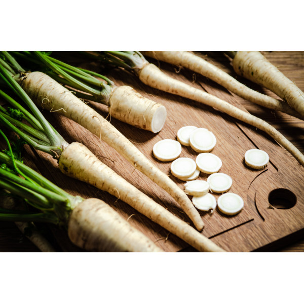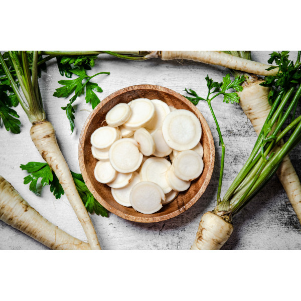 Goût : Le persil tubéreux a une saveur légèrement sucrée et un goût de noisette, plus doux que celui du persil feuille.