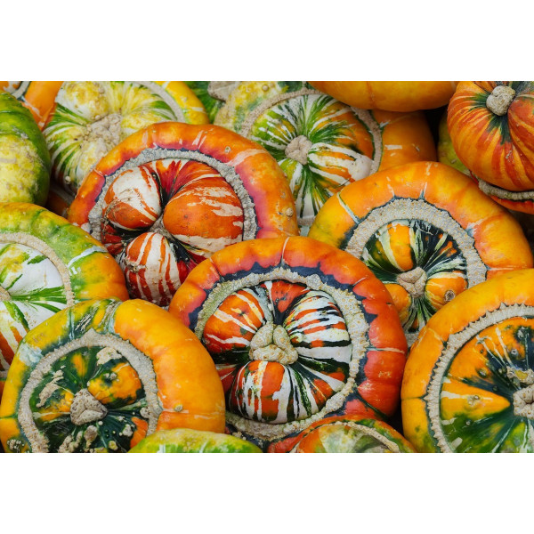 Couleur et motifs de la peau : La peau du Giraumon-Turban Turc présente un mélange de couleurs vives et variées. Les motifs multicolores incluent des nuances de vert, d'orange, et de jaune. Ces couleurs peuvent être striées ou mouchetées, donnant à chaque fruit un aspect unique.